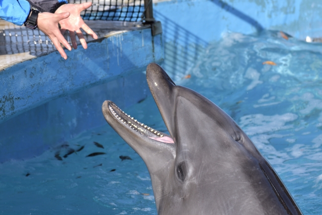 こんにちは、イルカ担当の飼育員です。きょうは少し風があり、水面がきらきらしていました。朝の練習では、合図を小さめにして落ち着いてもらうことを意識しましたが、最初のスピンがきれいに決まり、着水も静かで思わずうれしくなりました。