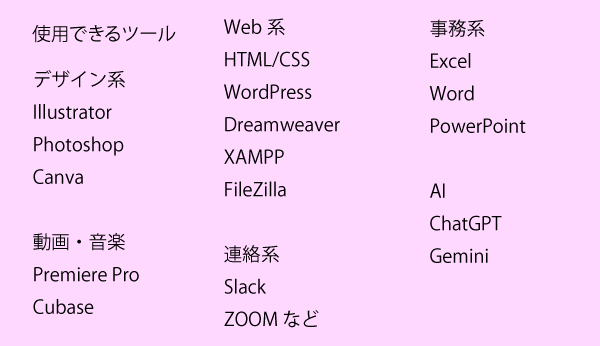 Illustrator・Photoshop・Premiere Proのほか、HTML/CSS・WordPressを体系的に学び直し、さらにAIの活用について理解を深めました。これにより、Webデザインから実装、効率化まで幅広く対応できる基礎を身につけました。